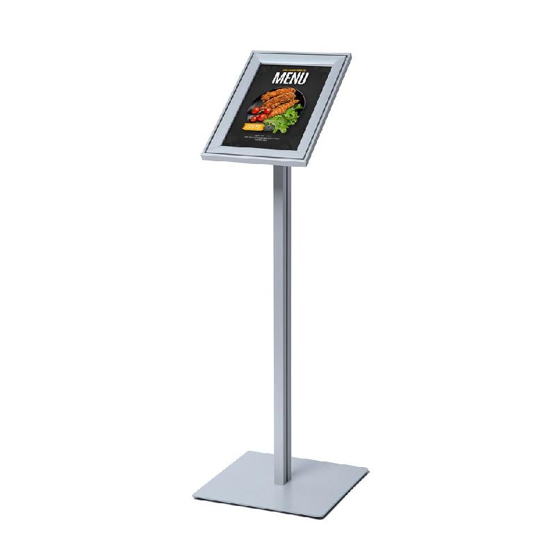 Hauteur totale : 465 mm - Caractéristiques : - Comprend une pochette en U en acrylique, enchâssée dans un profilé en aluminium anodisé argent. - Tube rond anodisé argent. - Pied en acier avec finition peinture poudre argent similaire RAL 9006. - Orientation : Portrait. - Diamètre du tub