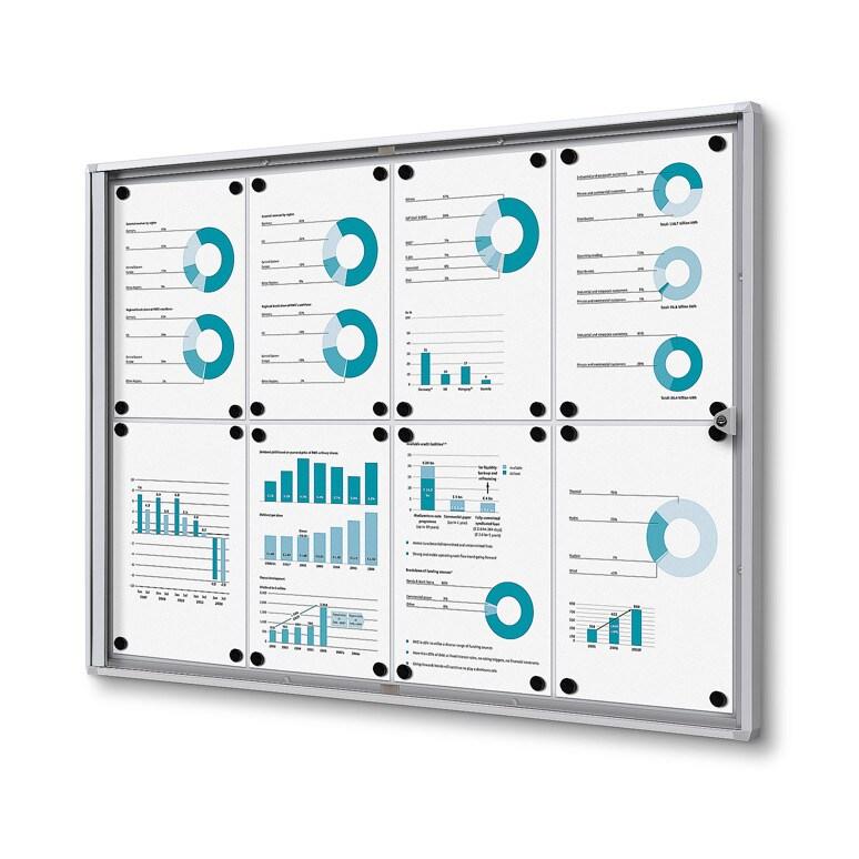 Pour une utilisation en intérieur : verrouillable, avec coins en plastique, porte battante latérale ; inscription avec marqueur.Matière : Aluminium - Profondeur (extérieur) : 30 mm - Couleur : argent.Matière panneau arrière : tableau magnétique - Couleur panneau arrière : blanc - Surface
