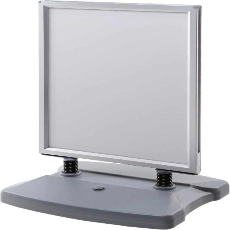Stop trottoir avec base de lestage pour une communication double face. - Changement d'affiche simple grâce à un système d'ouverture clic - clac. - Finition aluminium anodisé. - Remplissage facile de la base pour une meilleure résistance au vent. - Produit disponible pour différents formats