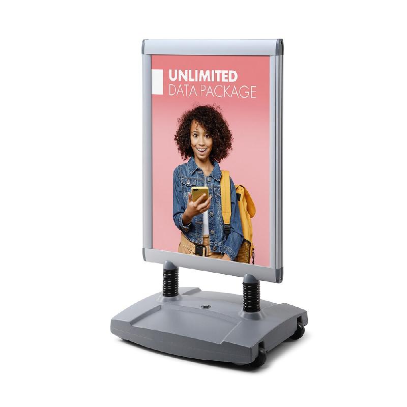 Stop trottoir avec base de lestage pour une communication double face. - Changement d'affiche simple grâce à un système d'ouverture clic - clac. - Finition aluminium anodisé. - Remplissage facile de la base pour une meilleure résistance au vent. - Produit disponible pour différents formats