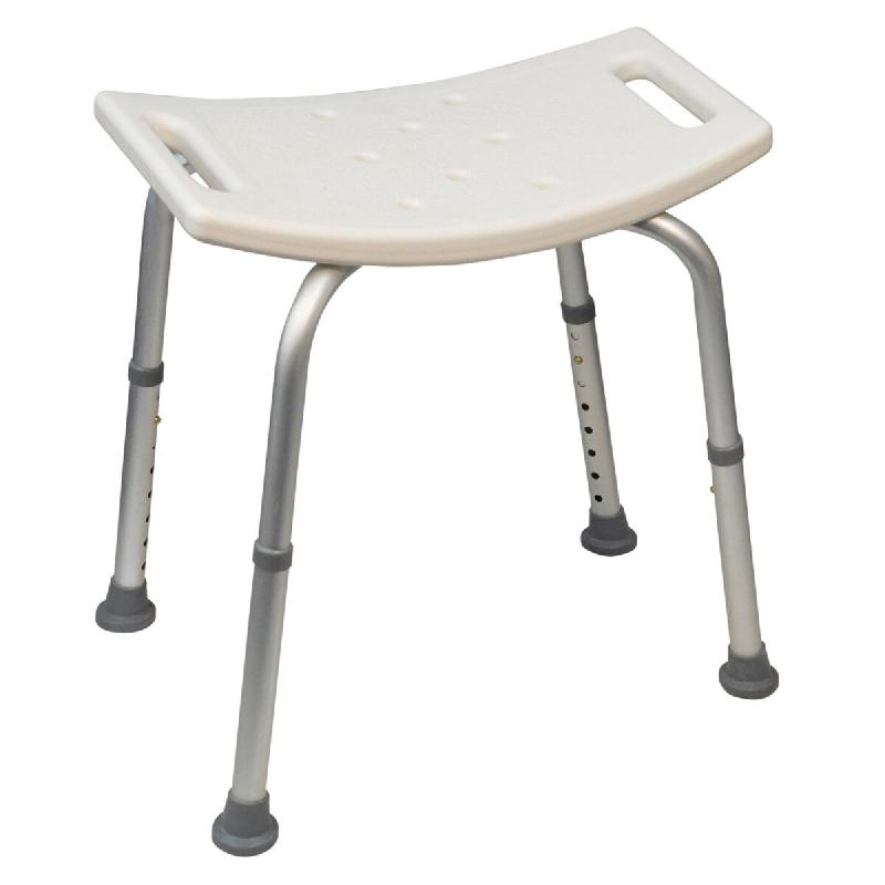 Tabouret de douche adapté aux personnes à mobilité réduite (PMR) - Capacité maximale : Jusqu'à 150 kg. - Hauteur réglable : 8 positions différentes, de 348 à 576 mm, pour un ajustement précis à chaque utilisateur. - Patins antidérapants : Sécurité optimale dans les zones humides tel