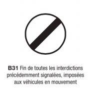 Le panneau B31 est un panneau d'interdiction et de fin d'interdiction indiquant une fin de toutes les interdictions précédemment signalées, imposées aux véhicules en mouvement (sauf celles concernant l'arrêt et le stationnement). En aucun cas il n'implique la disparition des prescriptions rés