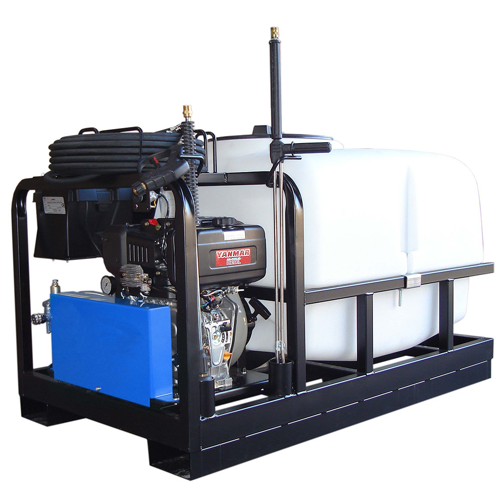 Notre modèle SKID SILENT 215 est équipé d'une pompe CAT, avec une pression réglable de 50 à 200 bars et un débit de 15 litres/minute. - Son moteur 3 cylindres diesel est de la marque reconnue pour sa fiabilité CATERPILLAR / PERKINS. - Sa citerne en tôle aluminium a une contenance de 50