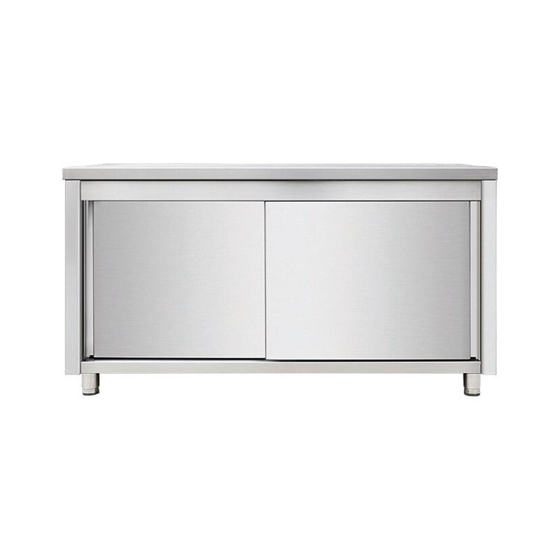 Armoire de travail en acier inoxydable AISI 304 avec portes coulissantes et rebord, 1900(L)x700(P)x880(H)mmModèle : Avec rebordExécution : Plan de travail renforcé avec un panneau de particules mélaminé résistant à l'eau de 18 mmMatériau : Acier inoxydable soudé AISI 304Pieds ronds réglabl
