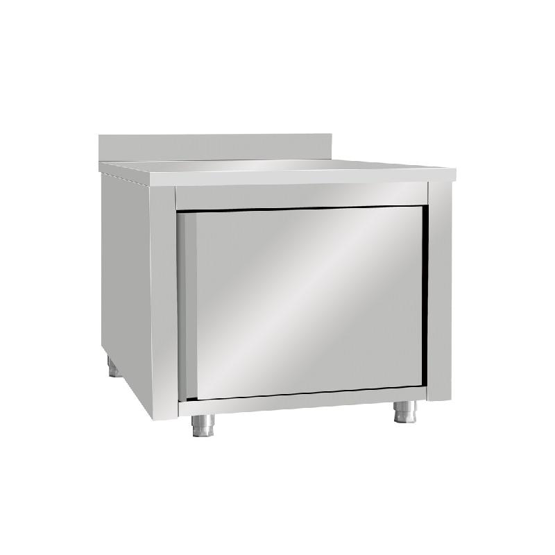 Armoire de travail en inox AISI 304 avec portes coulissantes et rebord, 1500(L)x700(P)x880(H)mmModèle : Avec rebordExécution : Plan de travail renforcé avec un panneau de particules mélaminé résistant à l'eau de 18 mmMatériau : Acier inoxydable soudé AISI 304Pieds ronds réglables en hauteu