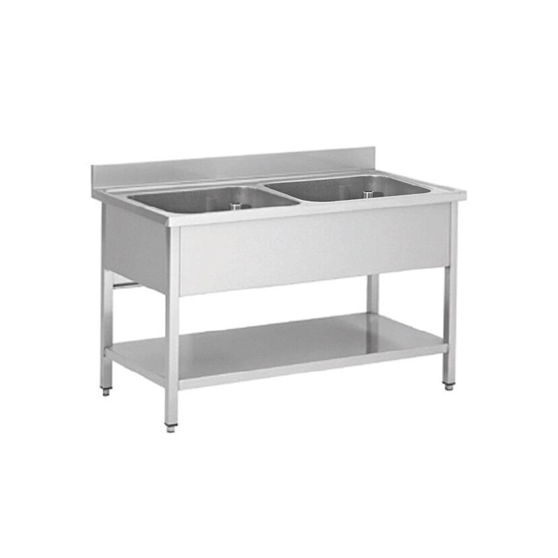 Évier avec 2 cuves et fond - Compact, robuste et hygiénique Cet évier en inox soudé AISI 304 est la solution idéale pour une utilisation professionnelle dans la gastronomie, les cuisines industrielles et autres domaines de travail avec des exigences d'hygiène élevées. Deux cuves de même t