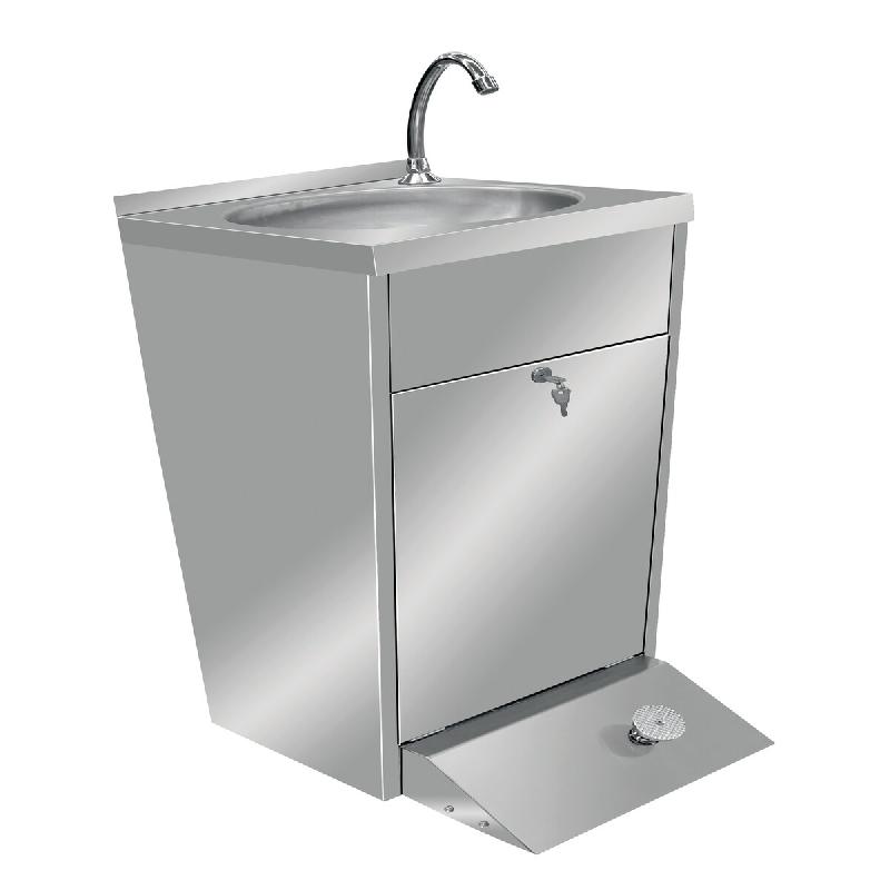 Lave - mains à faible encombrement - Caractéristiques du lave - mains : - Construction inox 18/10 - Lave - mains s'adaptant aux installations où l'on dispose de peu d'espaces - Valve mélangeuse anti - retour permettant de régler la température - Avec poussoir au pied - Poubelle intégré