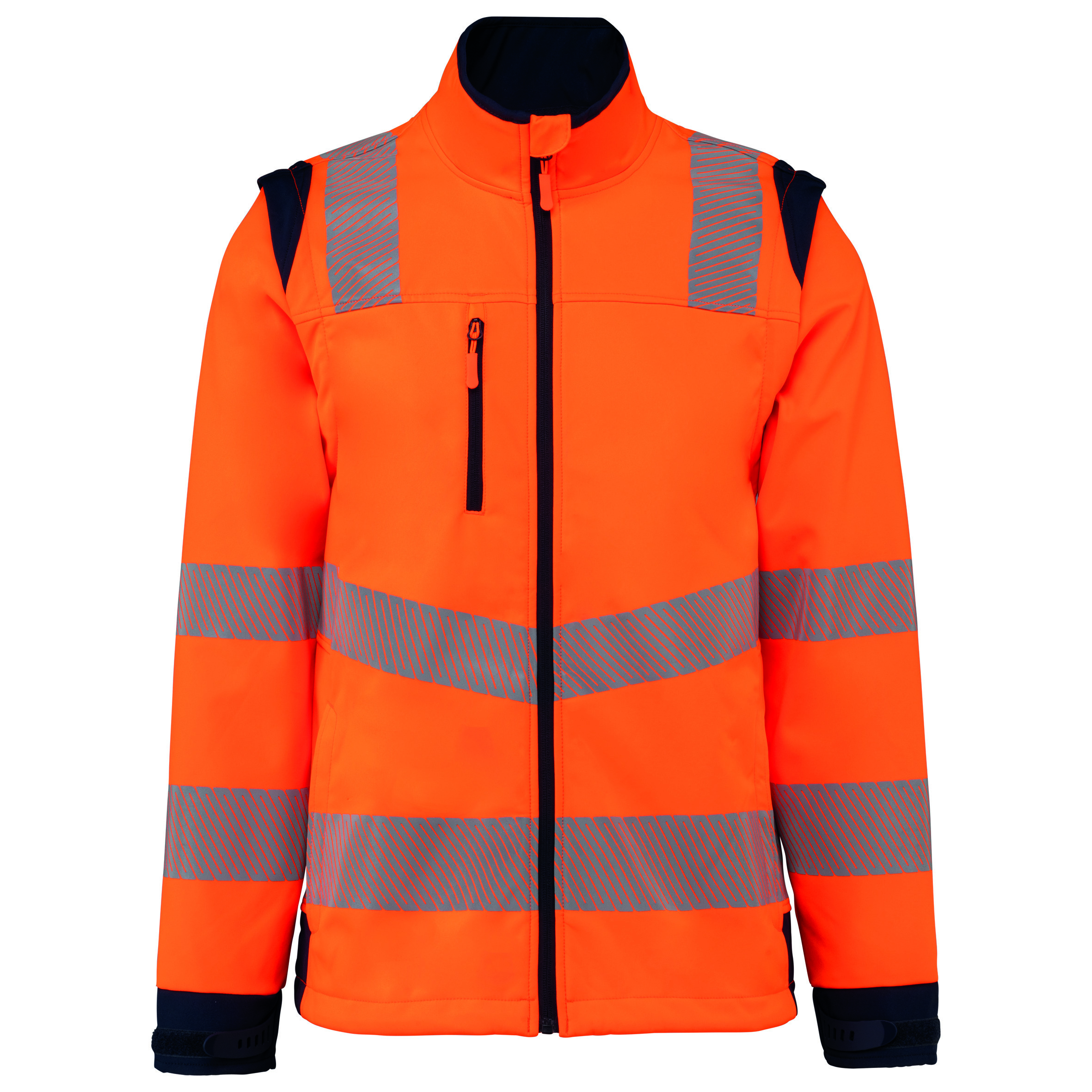 Blouson hiver softshell avec manches amovibles - INFORMATIONS PRATIQUES : - Référence produit : pantalon haute visibilité - Détails : - Softshell 100% Polyester enduit TPU - Intérieur polaire - Capuche tempête amovible - Bandes rétro réfléchissantes - Fermeture à glissière central