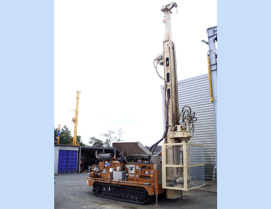 Sondeuse autonome hydraulique sur chenilles caoutchoucForeuse sur chenilles destinée à la recherche d'eau, rotary et fond de trou.Châssis - Largeur machine : 2,45 m - Longueur chenillard : 3,63 m - Poids en ordre de marche : 12 500 kg - Coffre de rangement et rack à tiges latéral - Moteur