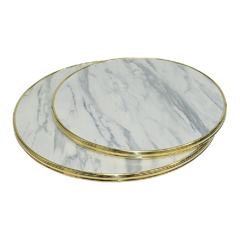Plateau de table TOPALIT, dimensions Ø60cm, épaisseur bord: 26 mm, épaisseur noyau: 16.5 mm. cerclage laiton - Le plateau TOPALIT est issu d'un procédé de moulage spécifique. - Le noyau est en fibre de bois. - Le plateau est recouvert d'un stratifié décor et ne présente pas de joint. GrÃ