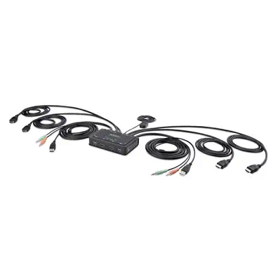 Switch KVM DisplayPort USB 2 ports avec ses câbles pieuvres combinés Commute le signal graphique DisplayPort, la souris et le clavier USB, périphériques USB 2.0, haut - parleurs stéréo et microphone, entre 2 ordinateurs. Spécifications : - Supporte les souris et claviers USB - Partage USB 2