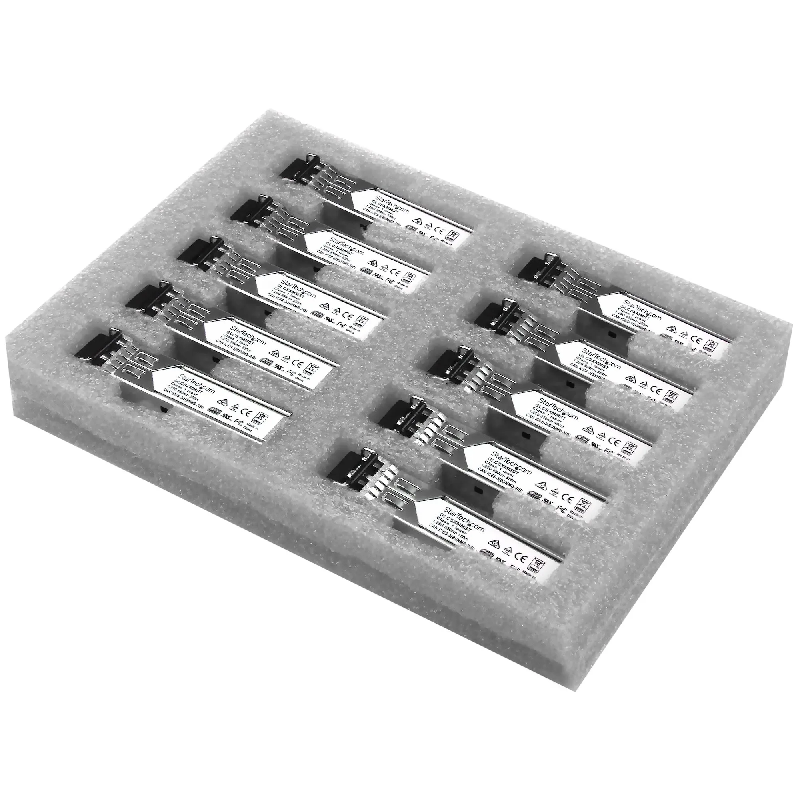 1000 Mbps (1 Gbps) | Fibre multimode | LC | 550 m | Garantie à vieLe lot GLCSXMM10PST comprend dix exemplaires de notre module de transceiver à fibre optique compatible avec Cisco GLC-SX-MM, qui a été conçu, programmé et testé pour fonctionner avec les commutateurs et routeurs de la marque Cisco®. Il fournit une connectivité 1 GbE fiable sur cble à fibre optique pour les réseaux conformes aux spécifications 1000BASE-SX, avec une distance maximale de 550 m.Spécifications techniques :€¢ Longueur d'onde : 850 nm€¢ Vitesse de transfert maximale : 1,25 Gbit/s€¢ Type : fibre optique multimode€¢ Type de connexion : connecteur LC€¢ Distance maximale de transfert : 550 m€¢ MTBF : 3 381 761 heures€¢ Consommation électrique : moins de 1 watt€¢ Contrôle de diagnostics numériques (DDM) : nonCe module SFP à fibre optique est échangeable à chaud, ce qui facilite les mises à niveau et les remplacements en minimisant les interruptions sur le réseau.SFP StarTech.comTous les modules SFP et les modules de transceiver SFP+ StarTech.com bénéficient d'une garantie à vie et de l'assistance technique à vie gratuite dans plusieurs langues. StarTech.com propose une grande variété de modules SFP et de cbles SFP à fixation directe, qui vous offrent l'ergonomie et la fiabilité dont vous avez besoin pour assurer des performances réseau fiables.The StarTech.com Advantage