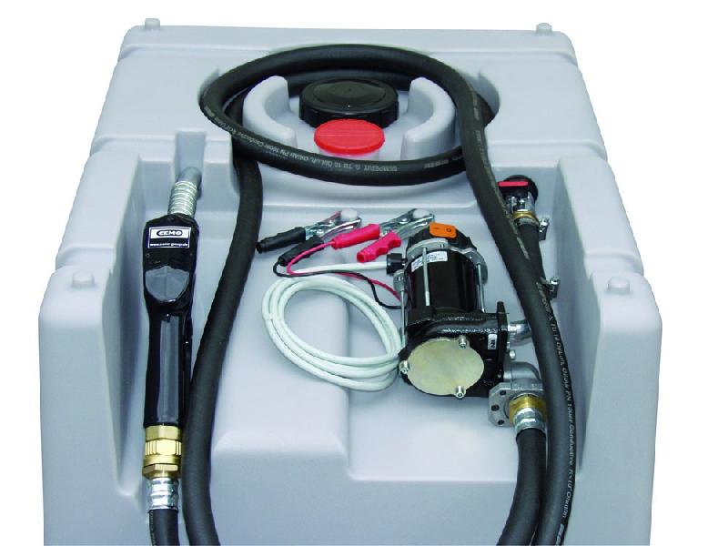 Cuve PE haute résistance toute équipée, pour gas - oil ou GNR - Caractéristiques principales : - Évent de surpression - Tube de remplissage anti - mousse - Paroi anti - roulis sur version 430L et 600L - Équipement de pompe : - Pompe électrique 12V (garantie 2 ans), débit : 40 l/min -