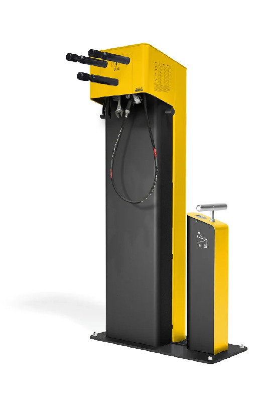 Stations de réparation de vélos en libre - service - 03 — GAMME ESSENTIAL - Station avec compresseur électrique 230V - TYPE DE STATION - Station de réparation standard au sol avec système de gonflage électrique, gamme STANDARD - MATÉRIAUX ET FINITION - Structure en acier galvanisé av