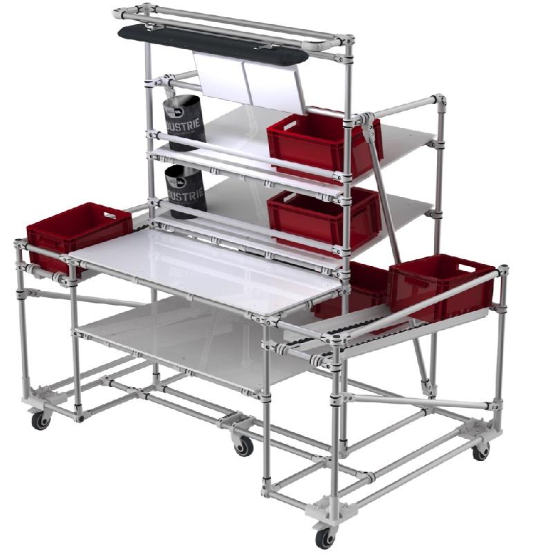 Poste de travail pour assemblage, packaging et contrôle. Pour industrie, logistique et e-commerce. 3 niveaux dont un retour vides. 2 convoyeurs FIFO retour vides, un de chaque côté. Niveaux en plaques permettant de gérer tous types de produits et d'emballages. Equipé d'un luminaire LED. Plan de travail à hauteur fixe, 70 cm en version travail assis et 90 cm en version travail debout. Peut être réglé selon vos spécifications. Niveaux approvisionnements et retours réglables. Butées stop réglables en hauteur des niveaux d'approvisionnement. Pentes réglables. Configurable sur demande (nous contacter). Monté sur roulettes. Structure tubulaire en Aluminium anodisé. Charge par niveau: nominal 150 kG.
