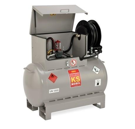 Station de ravitaillement essence KS MOBIL 200 litres avec pompe manuelle. Stations de ravitaillement essence et mélange huiles - essence : Homologuée selon ADR (livrée avec certificat d'homologation). Cuve antidéflagrante et résistante aux chocs. - Cuve simple paroi en acier laqué épaisseur