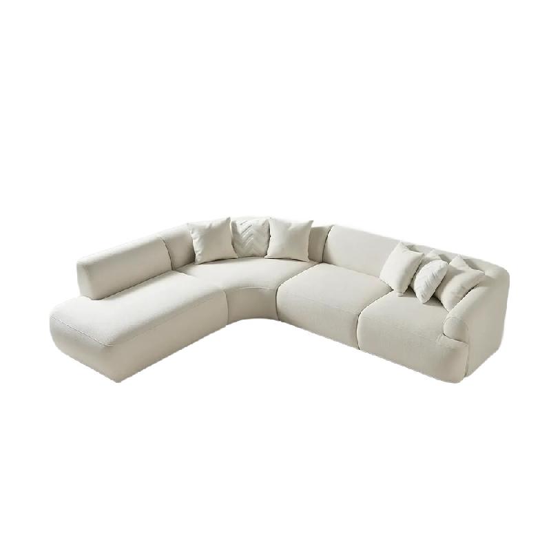 Le LONDON d'angle est un canapé modulable de 290 cm, parfait pour créer un espace convivial et design. Son assise profonde et ses courbes généreuses offrent un confort optimal tout en structurant élégamment votre salon.Revêtu d'une laine bouclée écrue ultra - douce, il séduit par son touch