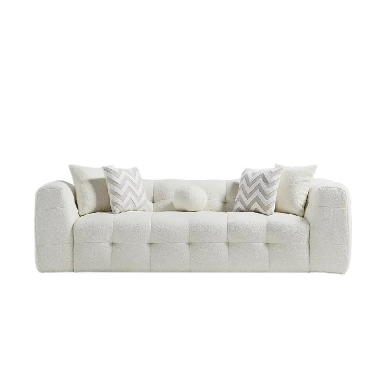 Le LUNA est un canapé 3/4 places à l'allure douce et enveloppante. Son revêtement en laine bouclée écrue apporte une texture chaleureuse et tendance, tandis que son capitonnage en damier lui confère un style unique, à mi-chemin entre mobilier moderne et objet sculptural.Avec ses formes arrondies et son assise généreuse, le LUNA offre un confort incomparable, idéal pour les moments de détente en famille ou entre amis. Sa structure basse et ses lignes courbes créent un effet cocon qui habille l'espace avec élégance.Le canapé LUNA s'intègre parfaitement dans les intérieurs contemporains, minimalistes ou inspirés du design organique.DimensionsLongueur : 230 cmProfondeur : 00 cmHauteur totale : 00 cmHauteur d'assise : 40 cmCaractéristiquesRevêtement : laine bouclée écrue (tissu doux et texturé)Structure : bois massif et mousse haute densitéConfort : assise moelleuse et maintien optimal grâce au capitonnageDesign : effet damier capitonné, forme arrondie et cocooningCapacité : 3/4 places
