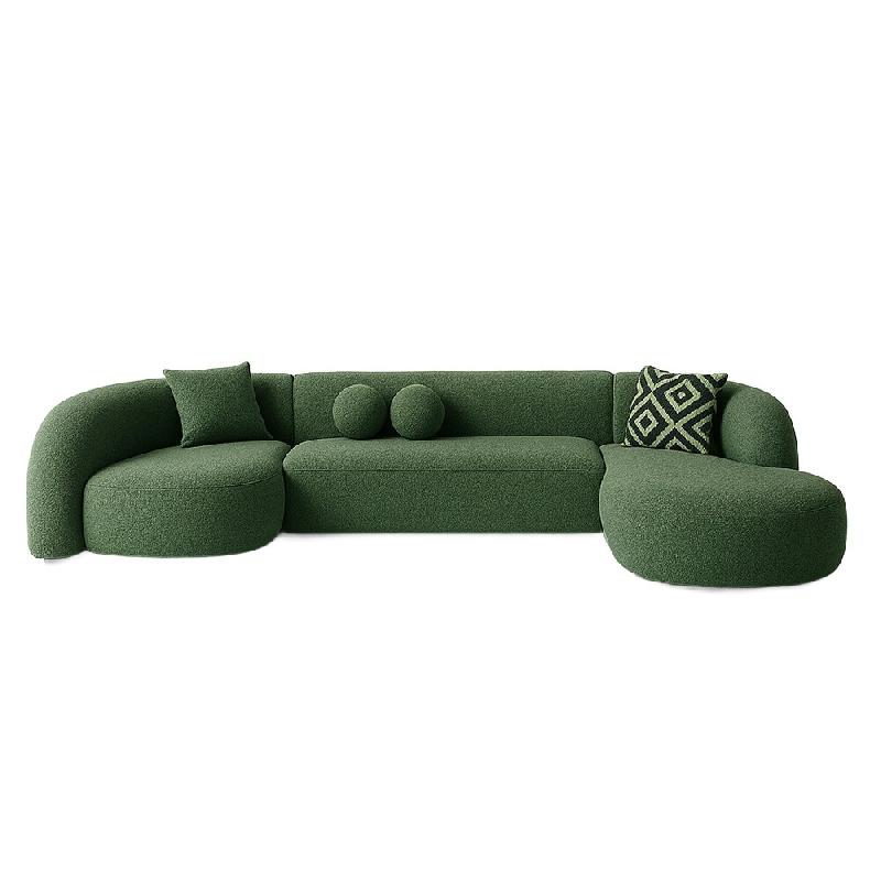 Le SERENITY est un canapé aux proportions généreuses et aux formes enveloppantes. Avec ses 350 cm de longueur, il offre une assise XXL pensée pour accueillir famille et amis dans un confort absolu.Ses accoudoirs arrondis et ses courbes douces créent un esprit cocooning tout en apportant une touche design ultra contemporaine. Sa structure basse et ses volumes pleins rappellent les codes du mobilier organique, tendance forte de la décoration actuelle.Le revêtement en laine rasée Vert Cèdre offre un toucher doux et texturé, renforçant l'esprit cosy du canapé. Livré avec coussins et accessoires décoratifs assortis, le SERENITY transforme votre salon en un espace de détente chic et harmonieux.DimensionsLongueur totale : 350 cmProfondeur méridienne gauche : 160 cmProfondeur méridienne droite : 220 cmHauteur d'assise : 42 cmCaractéristiquesStructure : bois massif + mousse haute densitéRevêtement : laine rasée Vert CèdreDesign : courbes organiques, dossier bas, accoudoirs enveloppantsConfort : assise moelleuse, soutien optimalCapacité : 5 à 6 personnesAccessoires inclus : coussins décoratifs + coussins sphériques