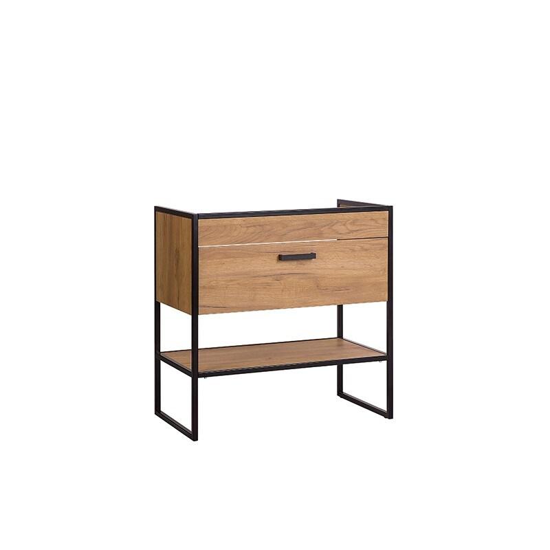 Meuble sous vasque de 80 cm sur pieds en acier noir, conçu pour accueillir une vasque encastrable de la collection Brooklyn. Ce meuble élégant se distingue par son tiroir en finition bois, doté d'une poignée intégrée en noir pour une esthétique harmonieuse. La porte est équipée de charnières silencieuses et d'un mécanisme de ralentissement, garantissant une utilisation en douceur. L'intérieur du meuble présente également une finition bois, tandis que les accents en acier noir ajoutent une touche moderne et sophistiquée à votre salle de bain.