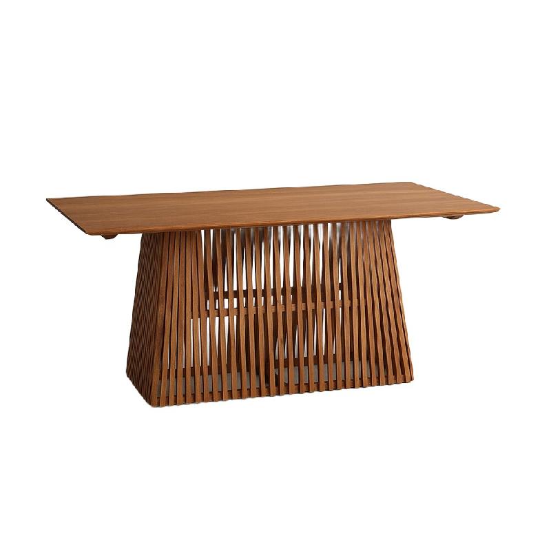 La table à manger FRANTZ séduit par son design rectangulaire et sa conception en bois massif de mindi, un bois noble reconnu pour sa résistance et sa durabilité. Son plateau de 160 cm de long repose sur une structure centrale pyramidale composée de poutres en bois, offrant à la fois stabilité et caractère.Le bois de mindi révèle de belles nuances naturelles allant du jaune clair au brun rouge, qui se patinent avec le temps pour donner encore plus de personnalité à la table. Sa finition soignée lui permet de s'intégrer aussi bien dans un intérieur moderne que dans une décoration plus classique.Compacte mais fonctionnelle, cette table est idéale pour les repas en famille ou entre amis et s'associe facilement avec différents styles de chaises.Caractéristiques techniques :Nom : FRANTZForme : rectangulaireDimensions totales : 160x79.5x76.5 cmÉpaisseur du plateau : 2 cmDimensions de la base : 113x48 cmMatériau : bois massif de mindiFinition : naturelCapacité : 4 à 6 personnesEntretien : dépoussiérage régulier + chiffon humide si nécessaireLivraison : livré non assemblé, emballage d'usineAvantages :Construction stable et robusteBois massif de mindi, noble et durableDesign rectangulaire élégant avec base pyramidaleTaille idéale pour 4 à 6 convives