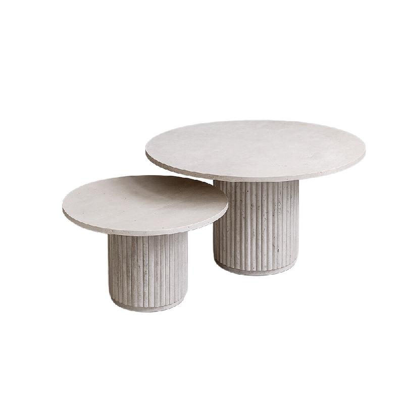 Le set de tables basses AKASSIA s'inspire des formes architecturales et du mobilier haut de gamme, mêlant travertin massif naturel et bois rainuré. Chaque table repose sur un piètement cylindrique cannelé en bois teinté miel, contrastant subtilement avec les plateaux en pierre claire.Ces trois