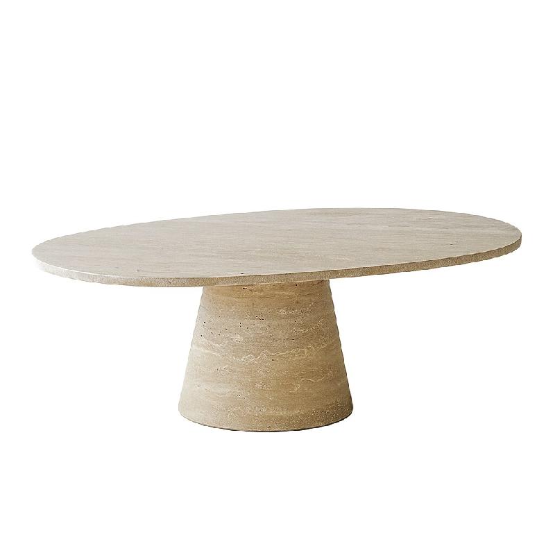 La table basse TINA est une création monumentale au format généreux, entièrement réalisée en travertin massif. Son design s'inspire des codes architecturaux classiques : un plateau ovale finement travaillé posé sur deux pieds cylindriques cannelés, rappelant les colonnes romaines.Cette tabl