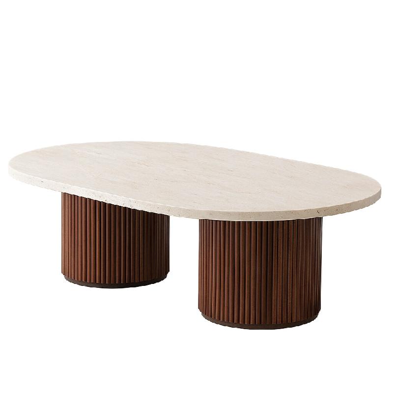 La table basse ALMA se distingue par son plateau en travertin naturel à la forme organique, cacahuète . Sculptée dans la pierre, sa surface révèle de subtils reliefs naturels et des variations minérales uniques, ce qui en fait une pièce singulière.Elle repose sur deux pieds cylindriques cann
