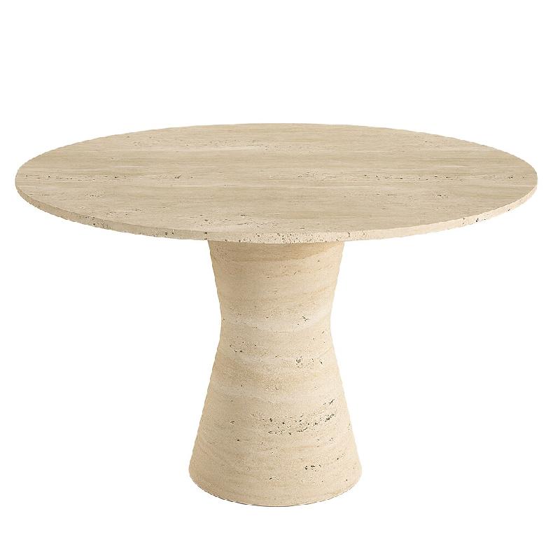 La table basse MURCIA revisite le mobilier en pierre avec une approche artistique et contemporaine. Son plateau en travertin massif adopte une forme organique irrégulière, évoquant les courbes fluides de la nature, tandis que ses trois pieds cylindriques cannelés rappellent les colonnes antiques