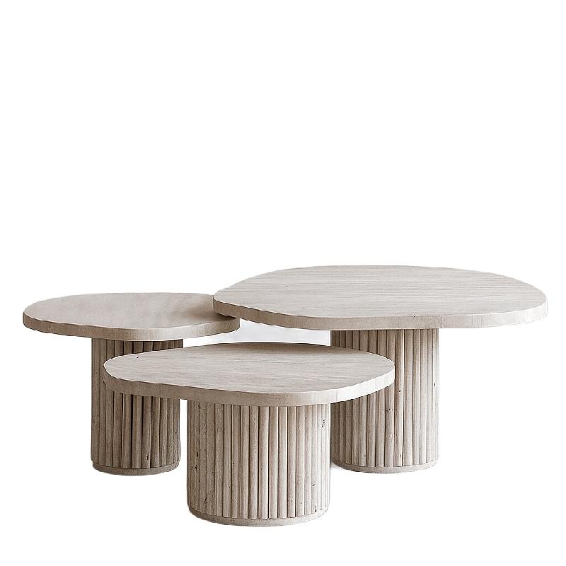 Le set de tables basses AKASSIA s'inspire des formes architecturales et du mobilier haut de gamme, mêlant travertin massif naturel et bois rainuré. Chaque table repose sur un piètement cylindrique cannelé en bois teinté miel, contrastant subtilement avec les plateaux en pierre claire.Ces trois