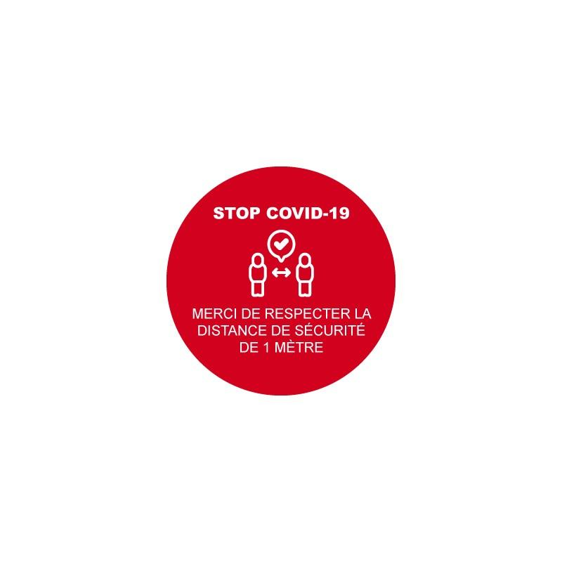 Sticker rond de distance de sécurité "Stop Covid-19. Merci de respecter la distance de sécurité de 1 mètre".