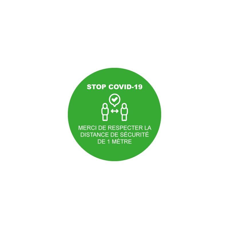 Sticker rond de distance de sécurité "Stop Covid-19. Merci de respecter la distance de sécurité de 1 mètre".