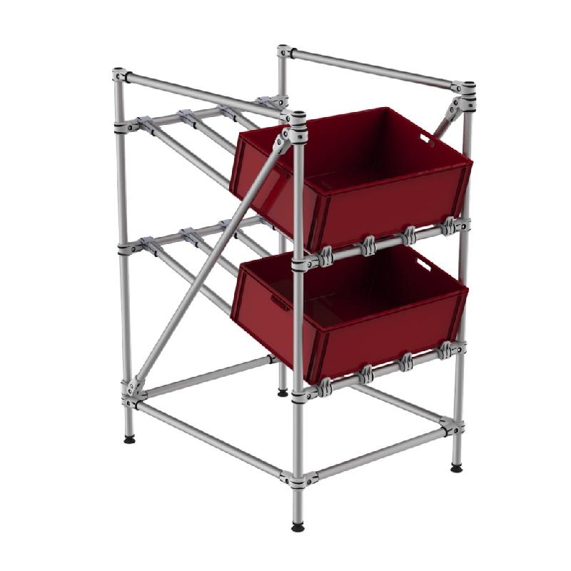 Presentoir à bacs KLT compact à 2 niveaux inclinables et barre stop frontale réglable en hauteur. Structure tubulaire robuste et ajustable. Niveaux réglables en inclinaison et hauteur au sol. Structure en aluminium légère et resistante. Montage sur pieds réglables au sol