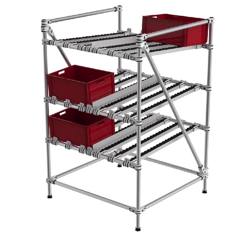 Flow Rack simple midsize à 2 niveaux FIFO et 1 niveau stockage bas. Rails à galets rivetés robustes et guides centraux anti - chutes. Butées stop en partie avant. Structure en Aluminium. Montage sur pieds réglables - Référence : 57 - 2 - Marque : Trilogiq