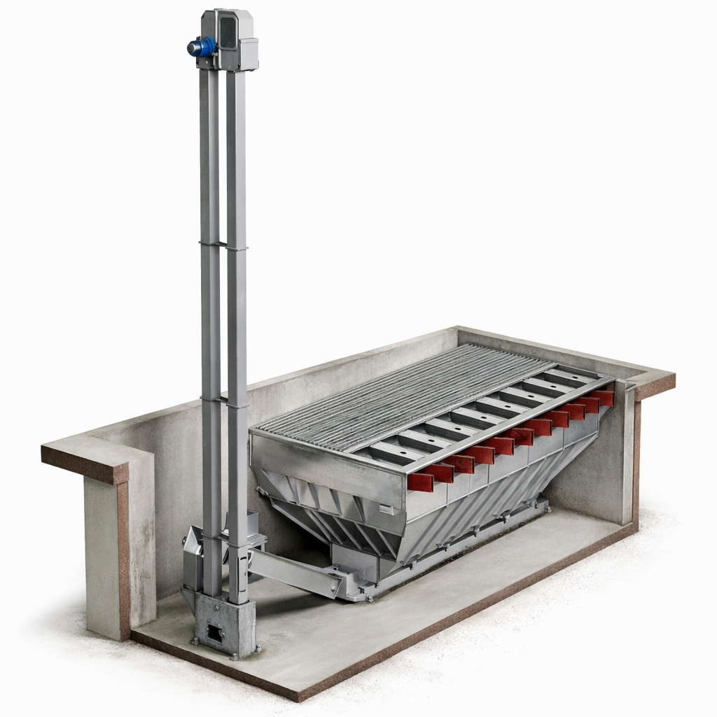 Le fond de la fosse est incliné pour faciliter l'évacuation des céréales vers le système de manutention suivant. Ce système réduit les risques de blocage ou d'encombrement et optimise le flux de matériaux.