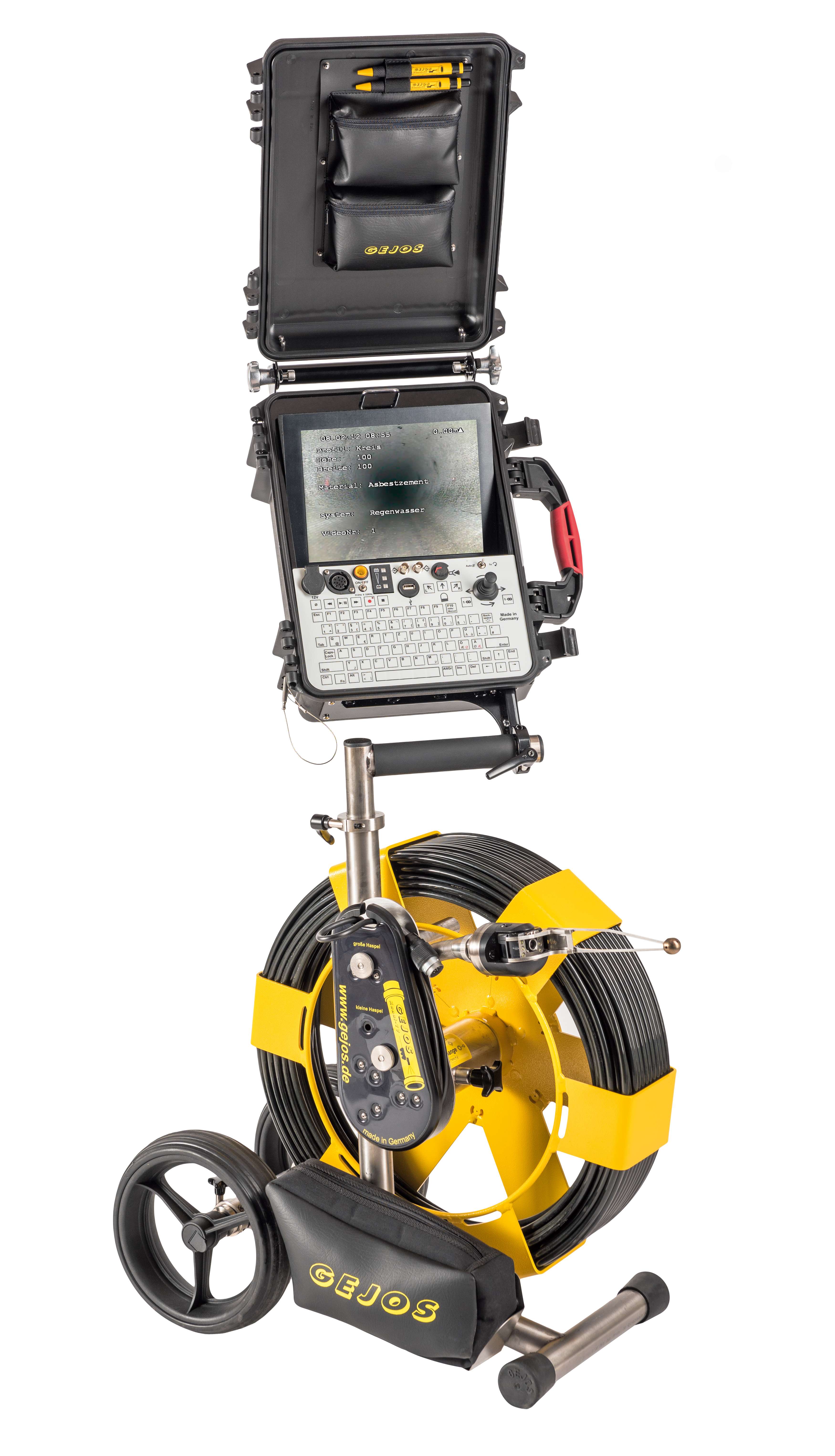 Système ITV sur jonc poussé, avec la caméra rotative Pan Tilt la plus petite du marché ! - Seulement 28mm, pour passer les coudes à 87° à partir du DN80 ! - Elle possède une sonde radio intégrée (512 Hz) et le contrôleur est muni d'un clavier pour commenter en temps réel les défauts r