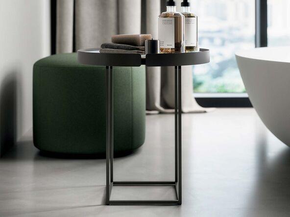 Table basse. Diamètre 46 ou 59 cm. Structure gris ombre. Plateau en gré de porcelaine 5 mm. Plateau rond.