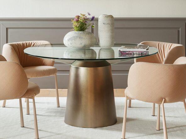 Table d'exception ronde Spike Midj. Dessinée par Giulio Iacchetti, associe raffinement et robustesse. Son plateau en verre trempé de 12 mm, disponible en version ronde Ø140 cm.