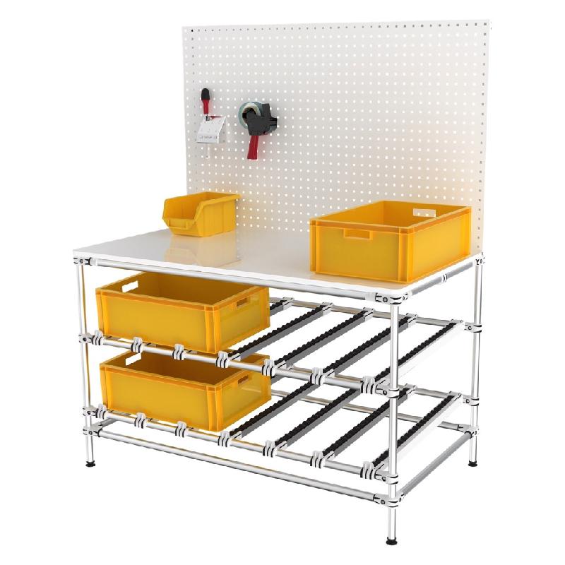 Poste de travail équipé d'une table blanche et panneaux porte - outils verticaux. Idéal pour packaging, assemblage ou opérations de finition et de contrôle. Charges 150 kg/ niveau en standard, fabrication Aluminium. Le modèle est équipé d'un niveau FIFO et d'un niveau de stockage en partie i