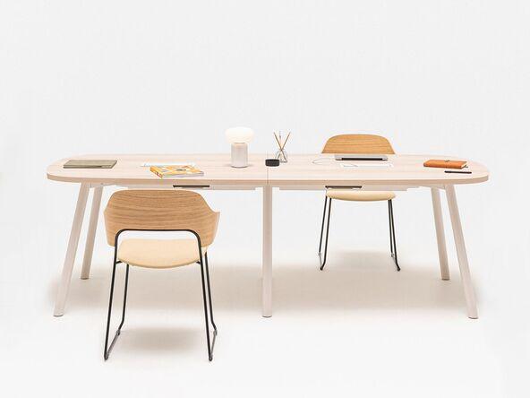 Fabriquée à Honfleur en France, la table de réunion DIALOGUE est un choix fonctionnel de l'aménagement des salles de réunion. Autour de cette table, des réunions ou des séances de travail en équipe se déroulent en sérénité. Les plateux sont disponibles en version sans ou avec tra