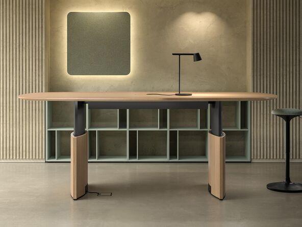 Table de réunion Elevation-e. Largeur 240 P120. Hauteur variable de 75 à 120 cm. Pieds panneaux. Plateau placage bois.