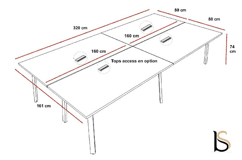 Cette vaste table est composée de 4 grands plateaux de 160x80 cm chacun, développant une dimension totale de 320x161 cm.