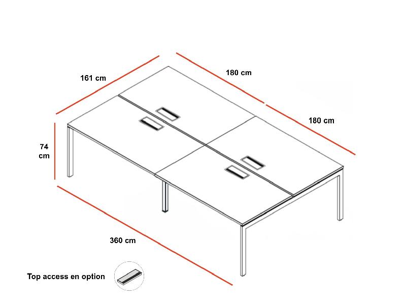 Pour une utilisation pratique, le plateau est arrondi aux angles, ce qui facilite la circulation autour de la table et adoucit le design.Caractéristiques principales : - Trappes top access facilitant le passage de câbles, avec double ouverture et bac permettant d'y disposer des prises électrique