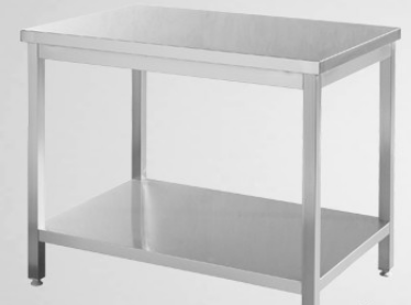 Tables en acier inoxydable avec pieds fixes et fabriquées en tôle de 2 mm d'épaisseur. - Domaine d'utilisation : - Tables en acier inoxydable aptes pour l'industrie alimentaire en général, conformément aux normes d'hygiène européennes. - Caractéristiques : - Modèles standard ou sur mes