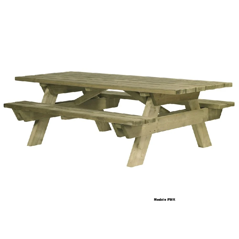 Table pique - nique en bois "BERLIN" rallongée Pour Personne à Mobilité Réduite (PMR) Descriptif : En pin du Nord traité autoclave classe IV certifié FSC Garantie 10 ans à poser ou à sceller. Modèle à sceller avec renfort anti vandalisme : renfort métallique à l'intérieur des pieds