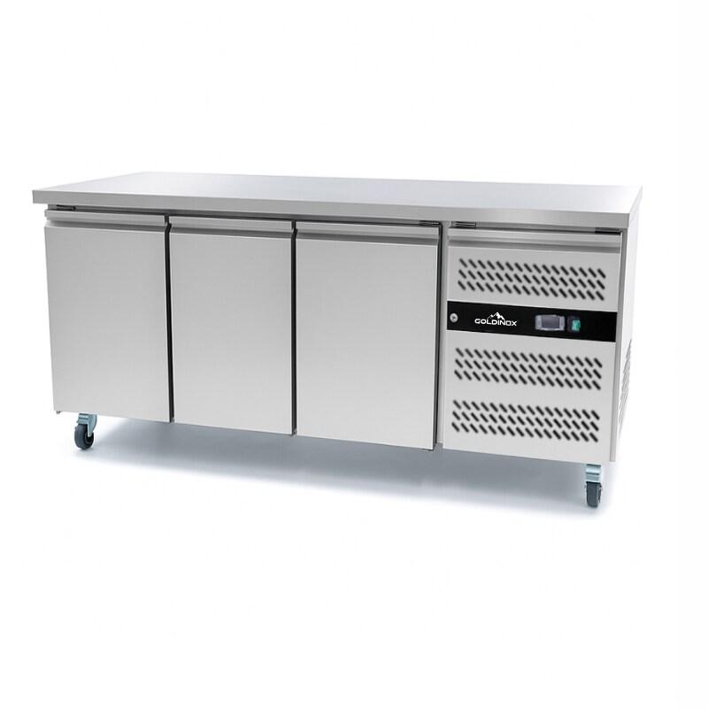 Table de congélation adossée Tropicalisée 3 portes PREMIUM - GOLDINOX - Table de congélation adossée PREMIUM en acier inox AISI 304, conçue pour le stockage négatif en cuisine professionnelle. - Dosseret arrière hauteur 100 mm - 3 portes à fermeture automatique avec joints amovibles -