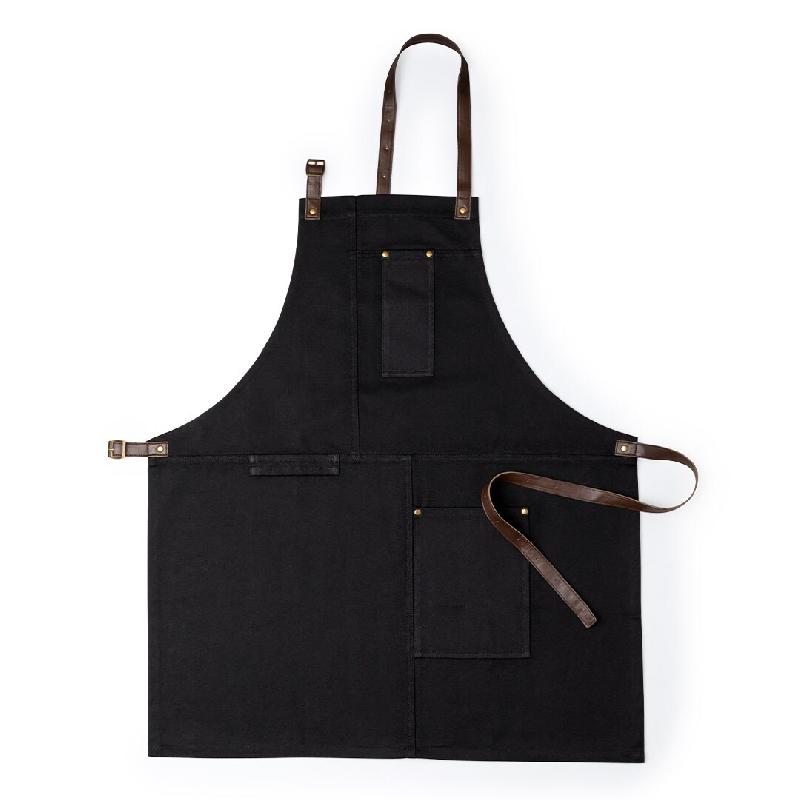 Tablier professionnel de haute qualité, en toile de coton résistante de 340g/m2. Ajustable sous le genou, avec des lanières de cou et de taille en cuir PU résistant, dotées de boucles réglables et renforcées par des rivets métalliques. Comprend de nombreuses poches pour divers ustensiles, avec des coutures renforcées.
