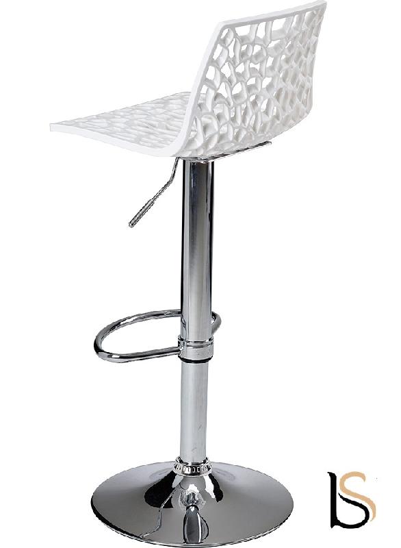 L'assise est réglable en hauteur de 56,5 à 77 cm par le pied chromé dont le diamètre de la base est de 38,5 cm.