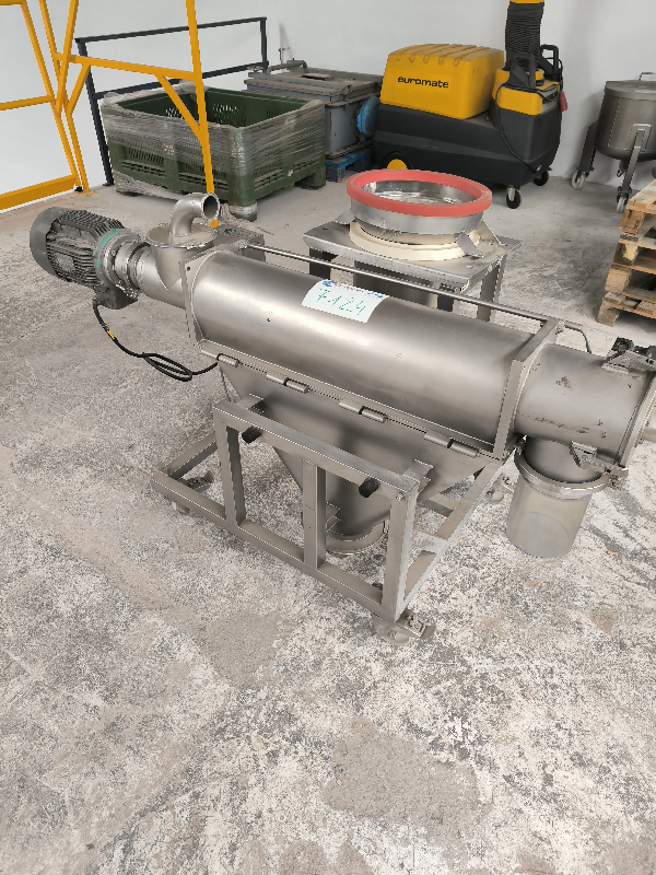 Tamis centrifuge fabriqué par Ceram en acier inoxydable. Monté sur un chariot en acier inoxydable à roulettes. Le même chariot contient une trémie de préalimentation qui est reliée au tamis à l'aide de tuyaux-raccords de type collier de serrage.