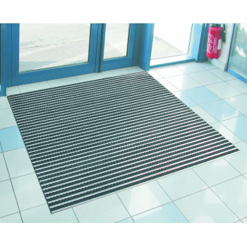 Tapis sur mesure pour intérieur constitué de profilés en alu brut assemblés, dans lequel viennent s'insérer des bandes de moquette anti-salissure.
